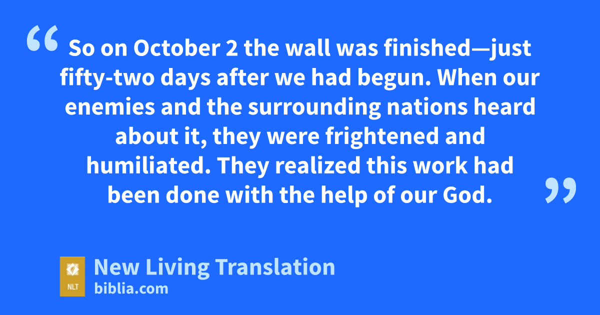 15 So on October 2* the wall was finished—just fifty-two days after we had begun. 16 When our enemies and the surrounding nations heard about it, they were frightened and humiliated. They realized this work had been done with the help of our God.