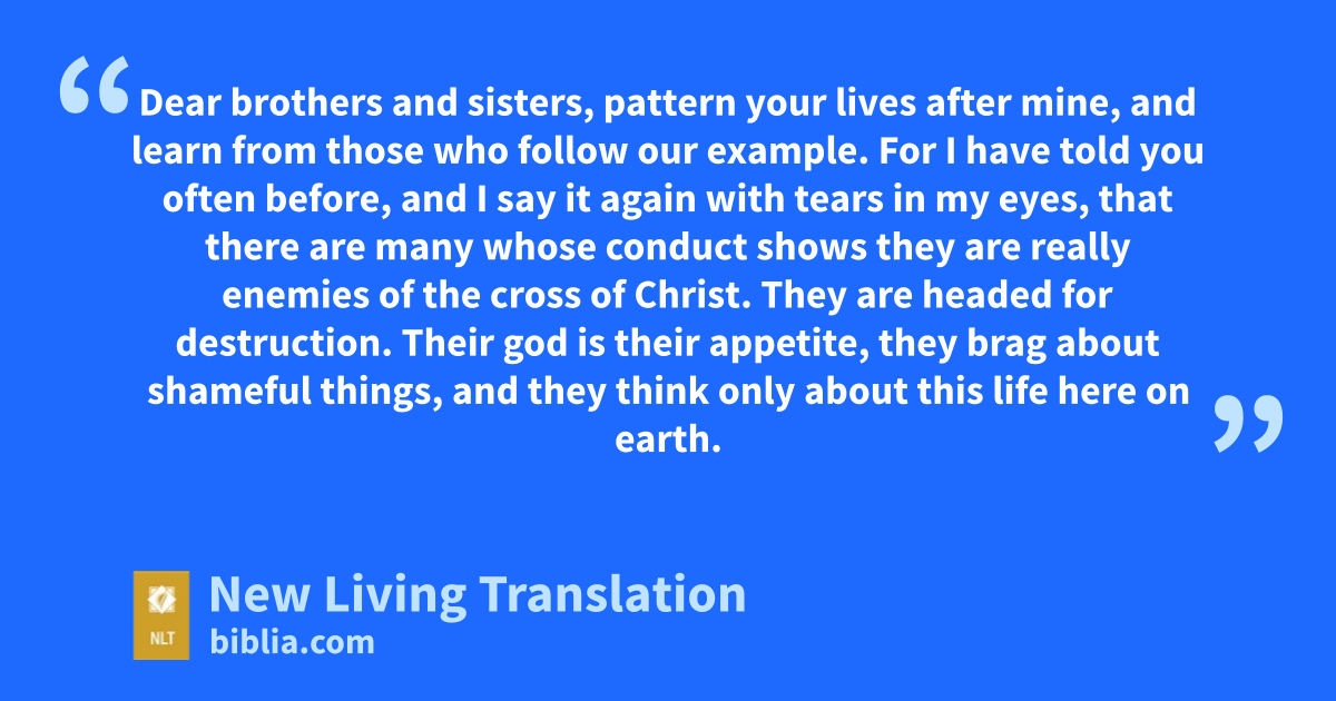 17 Dear brothers and sisters, pattern your lives after mine, and learn from those who follow our example. 18 For I have told you often before, and I say it again with tears in my eyes, that there are many whose conduct shows they are really enemies of the cross of Christ. 19 They are headed for destruction. Their god is their appetite, they brag about shameful things, and they think only about this life here on earth. 20 But we are citizens of heaven, where the Lord Jesus Christ lives. And we are eagerly waiting for him to return as our Savior. 21 He will take our weak mortal bodies and change them into glorious bodies like his own, using the same power with which he will bring everything under his control.