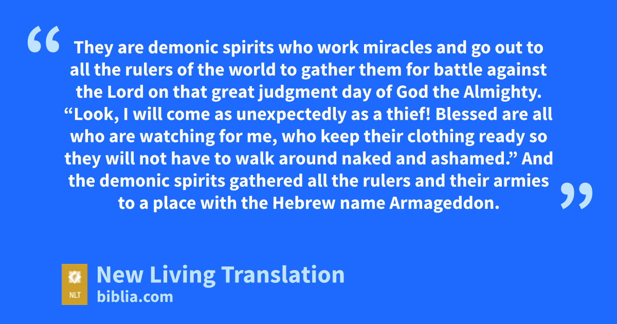 12 Then the sixth angel poured out his bowl on the great Euphrates River, and it dried up so that the kings from the east could march their armies toward the west without hindrance. 13 And I saw three evil* spirits that looked like frogs leap from the mouths of the dragon, the beast, and the false prophet. 14 They are demonic spirits who work miracles and go out to all the rulers of the world to gather them for battle against the Lord on that great judgment day of God the Almighty.