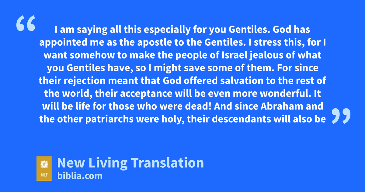 13 I am saying all this especially for you Gentiles. God has appointed me as the apostle to the Gentiles. I stress this, 14 for I want somehow to make the people of Israel jealous of what you Gentiles have, so I might save some of them. 15 For since their rejection meant that God offered salvation to the rest of the world, their acceptance will be even more wonderful. It will be life for those who were dead! 16 And since Abraham and the other patriarchs were holy, their descendants will also be holy—just as the entire batch of dough is holy because the portion given as an offering is holy. For if the roots of the tree are holy, the branches will be, too.