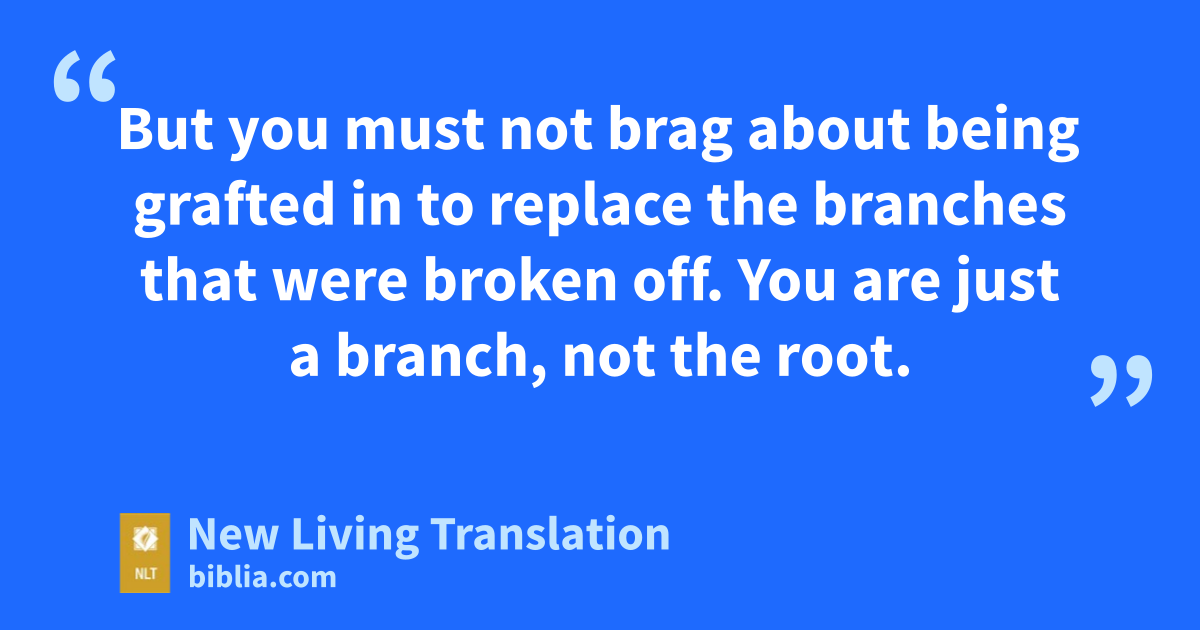 17 But some of these branches from Abraham’s tree—some of the people of Israel—have been broken off. And you Gentiles, who were branches from a wild olive tree, have been grafted in. So now you also receive the blessing God has promised Abraham and his children, sharing in the rich nourishment from the root of God’s special olive tree. 18 But you must not brag about being grafted in to replace the branches that were broken off. You are just a branch, not the root.
