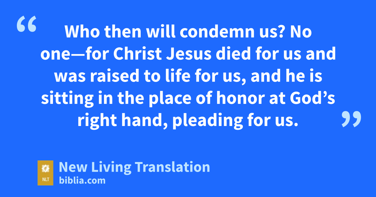 31 What shall we say about such wonderful things as these? If God is for us, who can ever be against us? 32 Since he did not spare even his own Son but gave him up for us all, won’t he also give us everything else? 33 Who dares accuse us whom God has chosen for his own? No one—for God himself has given us right standing with himself. 34 Who then will condemn us? No one—for Christ Jesus died for us and was raised to life for us, and he is sitting in the place of honor at God’s right hand, pleading for us.