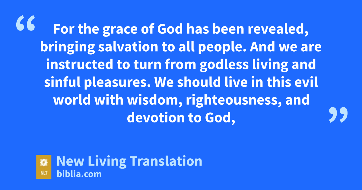11 For the grace of God has been revealed, bringing salvation to all people. 12 And we are instructed to turn from godless living and sinful pleasures. We should live in this evil world with wisdom, righteousness, and devotion to God, 13 while we look forward with hope to that wonderful day when the glory of our great God and Savior, Jesus Christ, will be revealed. 14 He gave his life to free us from every kind of sin, to cleanse us, and to make us his very own people, totally committed to doing good deeds.