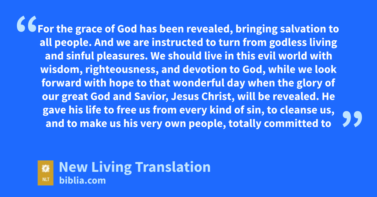 11 For the grace of God has been revealed, bringing salvation to all people. 12 And we are instructed to turn from godless living and sinful pleasures. We should live in this evil world with wisdom, righteousness, and devotion to God, 13 while we look forward with hope to that wonderful day when the glory of our great God and Savior, Jesus Christ, will be revealed. 14 He gave his life to free us from every kind of sin, to cleanse us, and to make us his very own people, totally committed to doing good deeds.