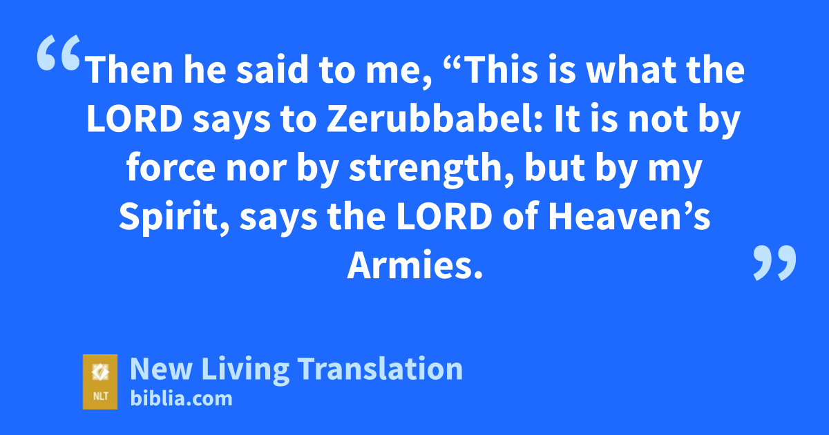 6 Then he said to me, “This is what the Lord says to Zerubbabel: It is not by force nor by strength, but by my Spirit, says the Lord of Heaven’s Armies. 7 Nothing, not even a mighty mountain, will stand in Zerubbabel’s way; it will become a level plain before him! And when Zerubbabel sets the final stone of the Temple in place, the people will shout: ‘May God bless it! May God bless it!’* ”