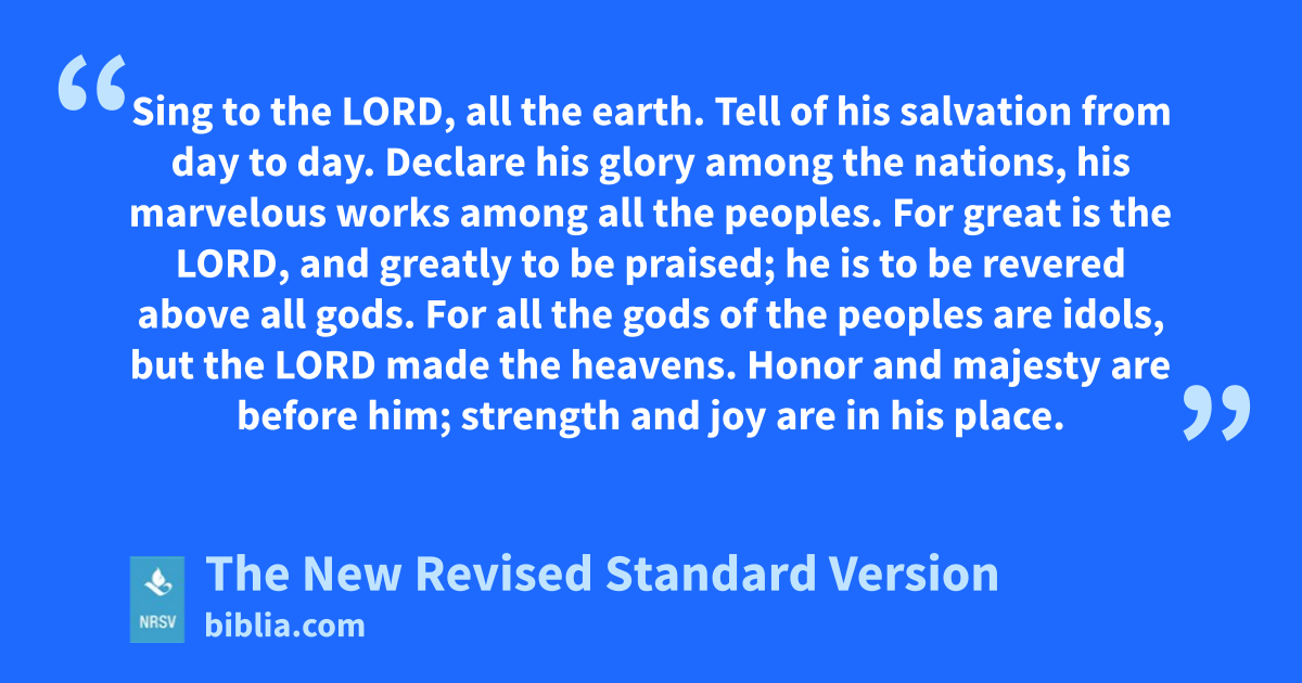 Sing to the LORD, all the earth. Tell of his salvation from day to day. Declare his glory among the nations, his marvelous works among all the peoples. For great is the LORD, and greatly to be praised; he is to be revered above all gods. For all the gods of the peoples are idols, but the LORD made the heavens. Honor and majesty are before him; strength and joy are in his place.