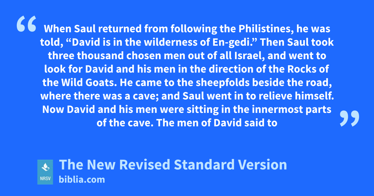 When Saul returned from following the Philistines, he was told, “David is in the wilderness of En-gedi.” Then Saul took three thousand chosen men out of all Israel, and went to look for David and his men in the direction of the Rocks of the Wild Goats. He came to the sheepfolds beside the road, where there was a cave; and Saul went in to relieve himself. Now David and his men were sitting in the innermost parts of the cave. The men of David said to
