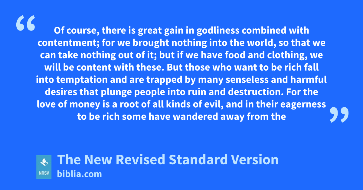Of course, there is great gain in godliness combined with contentment; for we brought nothing into the world, so that we can take nothing out of it; but if we have food and clothing, we will be content with these. But those who want to be rich fall into temptation and are trapped by many senseless and harmful desires that plunge people into ruin and destruction. For the love of money is a root of all kinds of evil, and in their eagerness to be rich some have wandered away from the