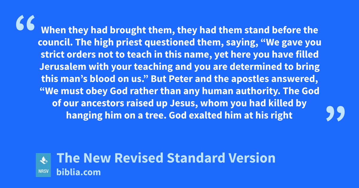 When they had brought them, they had them stand before the council. The high priest questioned them, saying, “We gave you strict orders not to teach in this name, yet here you have filled Jerusalem with your teaching and you are determined to bring this man’s blood on us.” But Peter and the apostles answered, “We must obey God rather than any human authority. The God of our ancestors raised up Jesus, whom you had killed by hanging him on a tree. God exalted him at his right