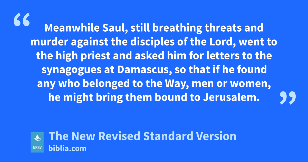 Meanwhile Saul, still breathing threats and murder against the disciples of the Lord, went to the high priest and asked him for letters to the synagogues at Damascus, so that if he found any who belonged to the Way, men or women, he might bring them bound to Jerusalem.