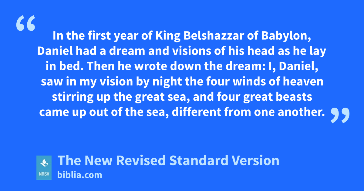 In the first year of King Belshazzar of Babylon, Daniel had a dream and visions of his head as he lay in bed. Then he wrote down the dream: I, Daniel, saw in my vision by night the four winds of heaven stirring up the great sea, and four great beasts came up out of the sea, different from one another.