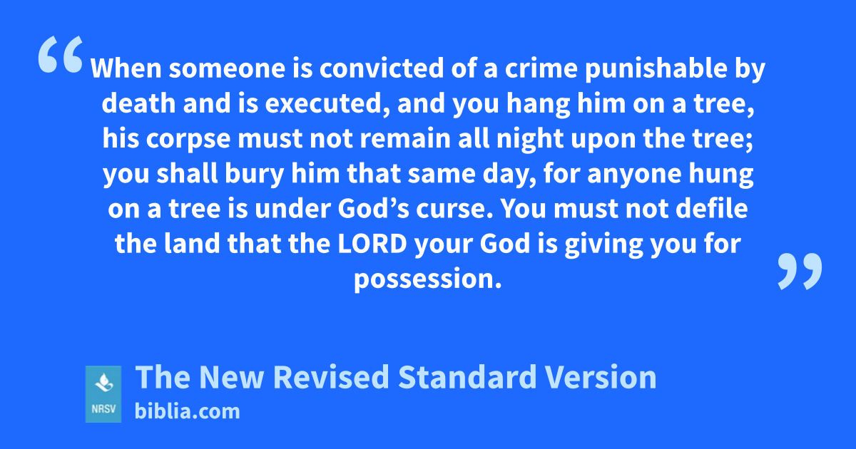 When someone is convicted of a crime punishable by death and is executed, and you hang him on a tree, his corpse must not remain all night upon the tree; you shall bury him that same day, for anyone hung on a tree is under God’s curse. You must not defile the land that the LORD your God is giving you for possession.