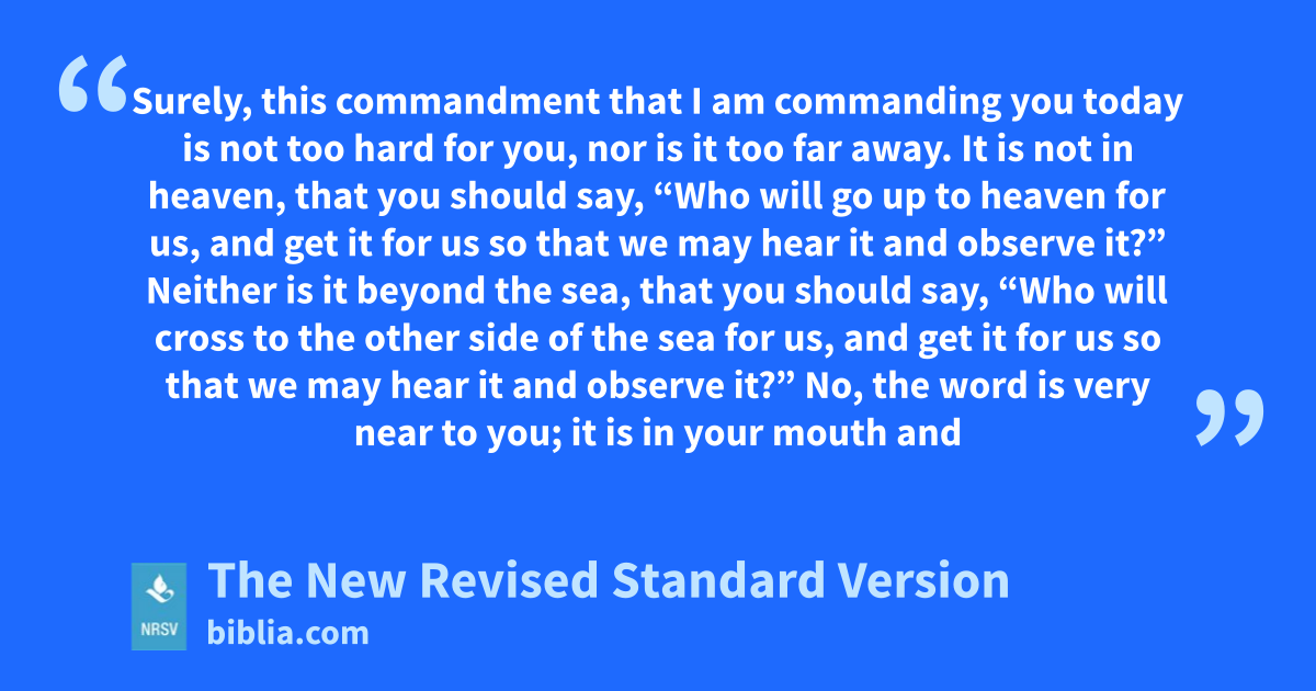 Surely, this commandment that I am commanding you today is not too hard for you, nor is it too far away. It is not in heaven, that you should say, “Who will go up to heaven for us, and get it for us so that we may hear it and observe it?” Neither is it beyond the sea, that you should say, “Who will cross to the other side of the sea for us, and get it for us so that we may hear it and observe it?” No, the word is very near to you; it is in your mouth and