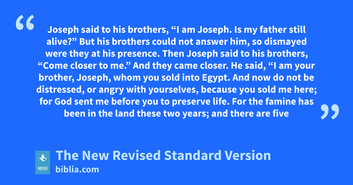 Joseph said to his brothers, “I am Joseph. Is my father still alive?” But his brothers could not answer him, so dismayed were they at his presence. Then Joseph said to his brothers, “Come closer to me.” And they came closer. He said, “I am your brother, Joseph, whom you sold into Egypt. And now do not be distressed, or angry with yourselves, because you sold me here; for God sent me before you to preserve life. For the famine has been in the land these two years; and there are five