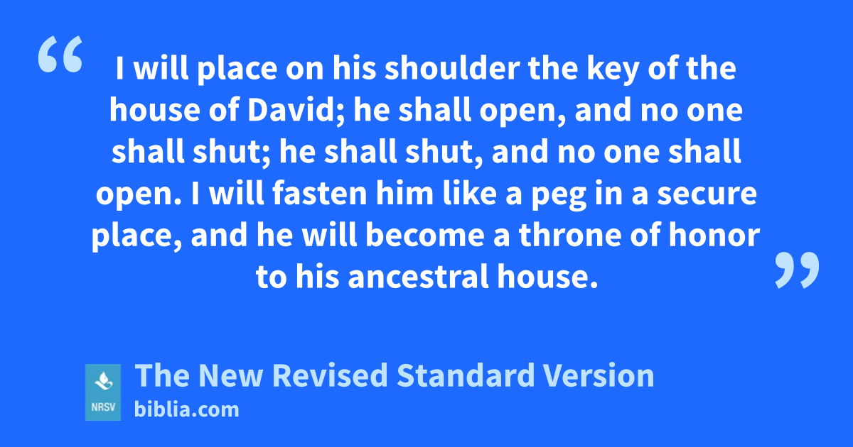 I will place on his shoulder the key of the house of David; he shall open, and no one shall shut; he shall shut, and no one shall open. I will fasten him like a peg in a secure place, and he will become a throne of honor to his ancestral house.