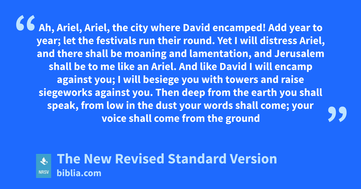 Ah, Ariel, Ariel, the city where David encamped! Add year to year; let the festivals run their round. Yet I will distress Ariel, and there shall be moaning and lamentation, and Jerusalem shall be to me like an Ariel. And like David I will encamp against you; I will besiege you with towers and raise siegeworks against you. Then deep from the earth you shall speak, from low in the dust your words shall come; your voice shall come from the ground