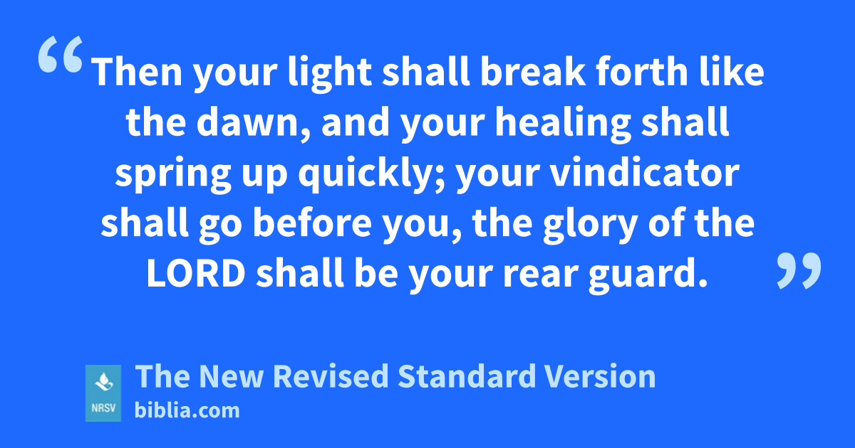 Then your light shall break forth like the dawn, and your healing shall spring up quickly; your vindicator shall go before you, the glory of the LORD shall be your rear guard.