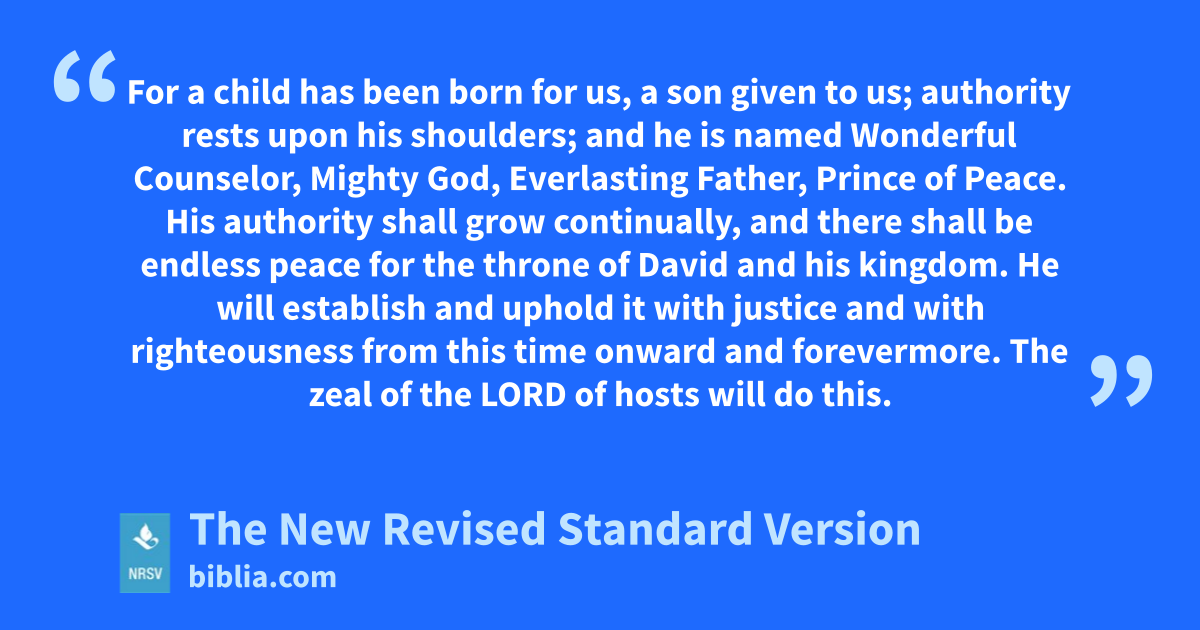 For a child has been born for us, a son given to us; authority rests upon his shoulders; and he is named Wonderful Counselor, Mighty God, Everlasting Father, Prince of Peace. His authority shall grow continually, and there shall be endless peace for the throne of David and his kingdom. He will establish and uphold it with justice and with righteousness from this time onward and forevermore. The zeal of the LORD of hosts will do this.