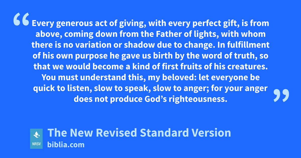 Every generous act of giving, with every perfect gift, is from above, coming down from the Father of lights, with whom there is no variation or shadow due to change. In fulfillment of his own purpose he gave us birth by the word of truth, so that we would become a kind of first fruits of his creatures. You must understand this, my beloved: let everyone be quick to listen, slow to speak, slow to anger; for your anger does not produce God’s righteousness.