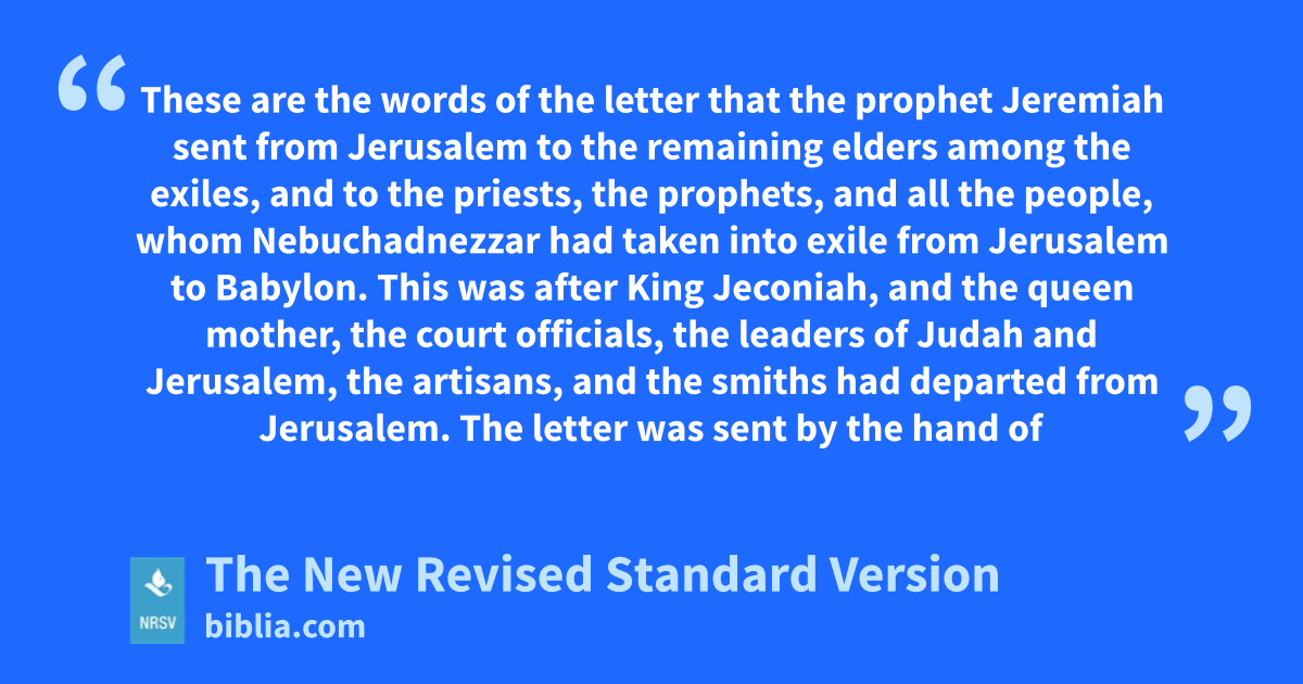 These are the words of the letter that the prophet Jeremiah sent from Jerusalem to the remaining elders among the exiles, and to the priests, the prophets, and all the people, whom Nebuchadnezzar had taken into exile from Jerusalem to Babylon. This was after King Jeconiah, and the queen mother, the court officials, the leaders of Judah and Jerusalem, the artisans, and the smiths had departed from Jerusalem. The letter was sent by the hand of