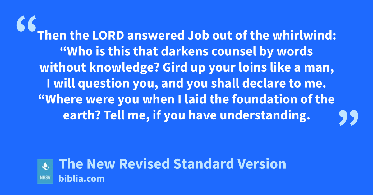 Then the LORD answered Job out of the whirlwind: “Who is this that darkens counsel by words without knowledge? Gird up your loins like a man, I will question you, and you shall declare to me. “Where were you when I laid the foundation of the earth? Tell me, if you have understanding.