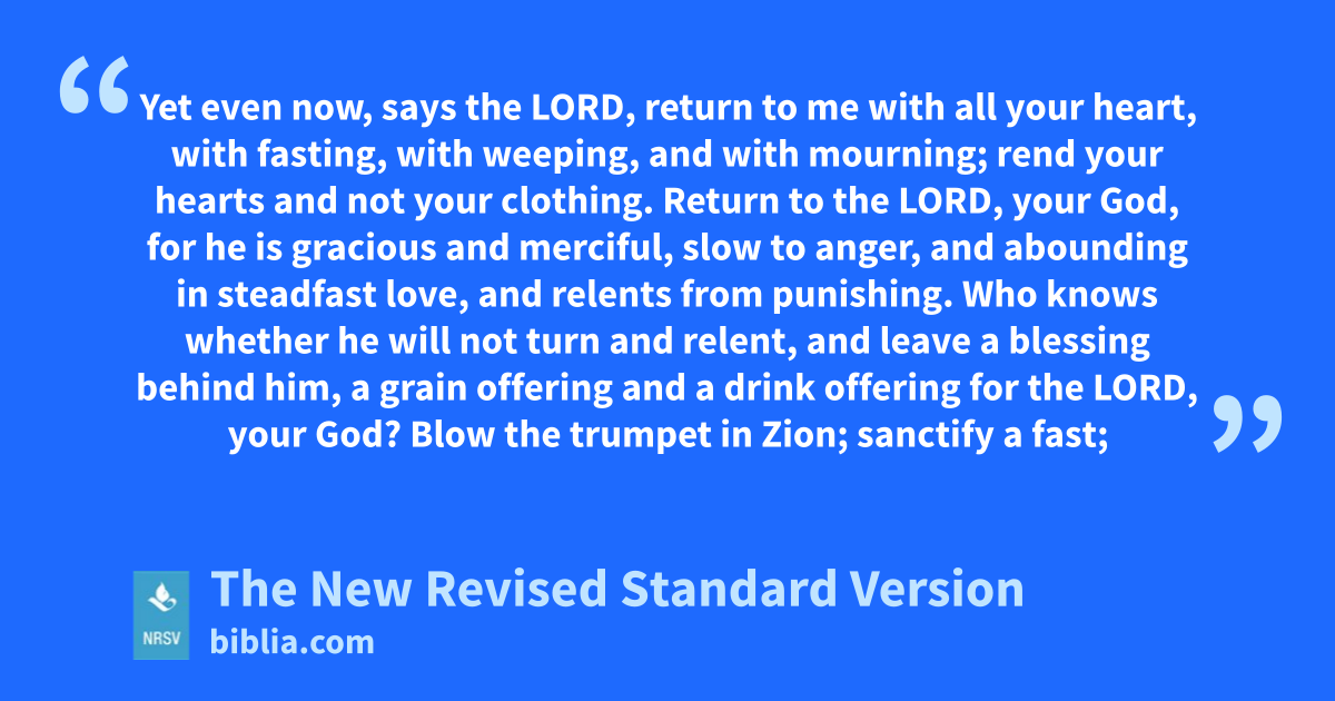 Yet even now, says the LORD, return to me with all your heart, with fasting, with weeping, and with mourning; rend your hearts and not your clothing. Return to the LORD, your God, for he is gracious and merciful, slow to anger, and abounding in steadfast love, and relents from punishing. Who knows whether he will not turn and relent, and leave a blessing behind him, a grain offering and a drink offering for the LORD, your God? Blow the trumpet in Zion; sanctify a fast;