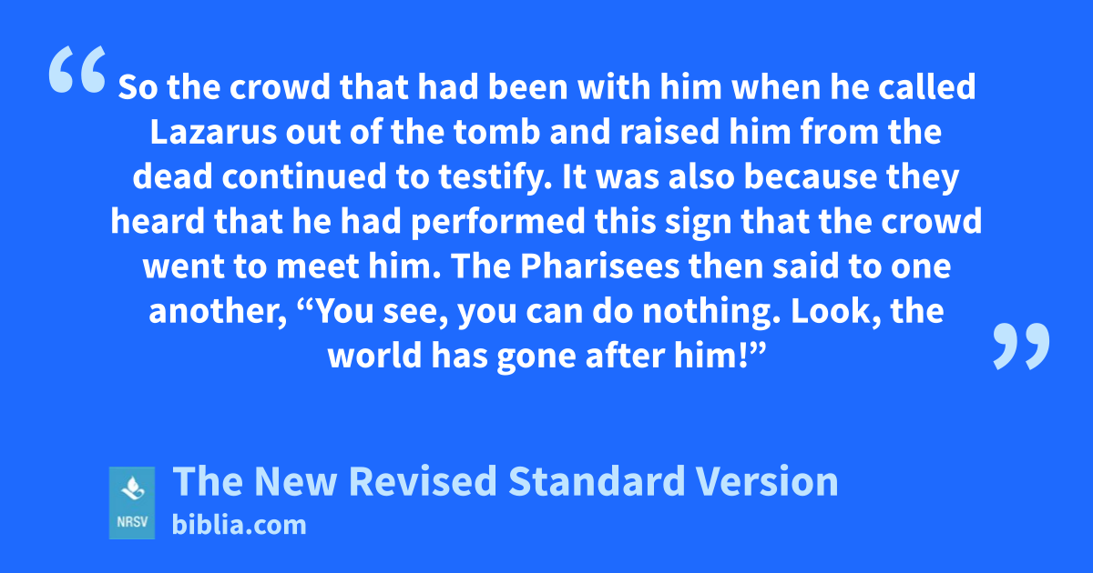 So the crowd that had been with him when he called Lazarus out of the tomb and raised him from the dead continued to testify. It was also because they heard that he had performed this sign that the crowd went to meet him. The Pharisees then said to one another, “You see, you can do nothing. Look, the world has gone after him!”