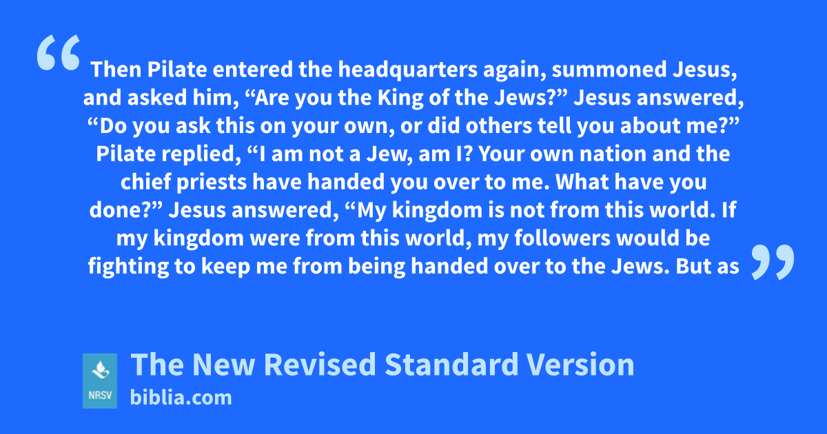 Then Pilate entered the headquarters again, summoned Jesus, and asked him, “Are you the King of the Jews?” Jesus answered, “Do you ask this on your own, or did others tell you about me?” Pilate replied, “I am not a Jew, am I? Your own nation and the chief priests have handed you over to me. What have you done?” Jesus answered, “My kingdom is not from this world. If my kingdom were from this world, my followers would be fighting to keep me from being handed over to the Jews. But as