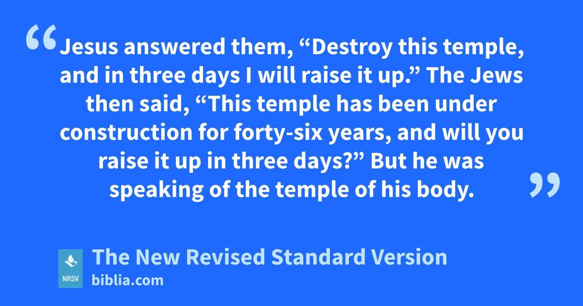 Jesus answered them, “Destroy this temple, and in three days I will raise it up.” The Jews then said, “This temple has been under construction for forty-six years, and will you raise it up in three days?” But he was speaking of the temple of his body.