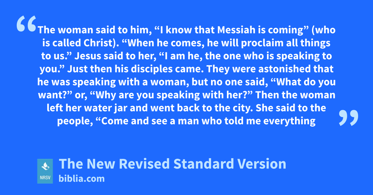The woman said to him, “I know that Messiah is coming” (who is called Christ). “When he comes, he will proclaim all things to us.” Jesus said to her, “I am he, the one who is speaking to you.” Just then his disciples came. They were astonished that he was speaking with a woman, but no one said, “What do you want?” or, “Why are you speaking with her?” Then the woman left her water jar and went back to the city. She said to the people, “Come and see a man who told me everything