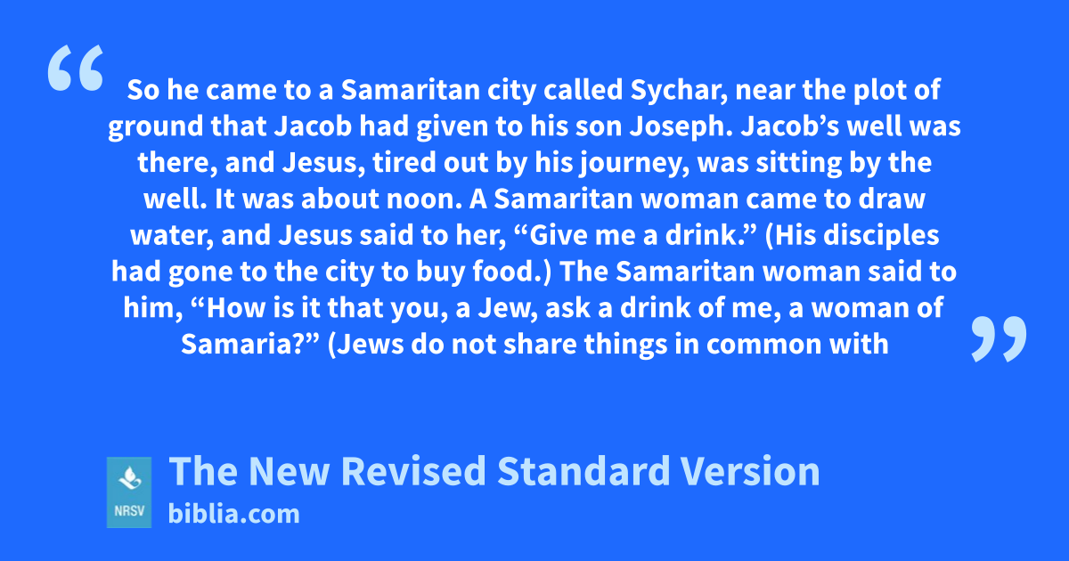 So he came to a Samaritan city called Sychar, near the plot of ground that Jacob had given to his son Joseph. Jacob’s well was there, and Jesus, tired out by his journey, was sitting by the well. It was about noon. A Samaritan woman came to draw water, and Jesus said to her, “Give me a drink.” (His disciples had gone to the city to buy food.) The Samaritan woman said to him, “How is it that you, a Jew, ask a drink of me, a woman of Samaria?” (Jews do not share things in common with
