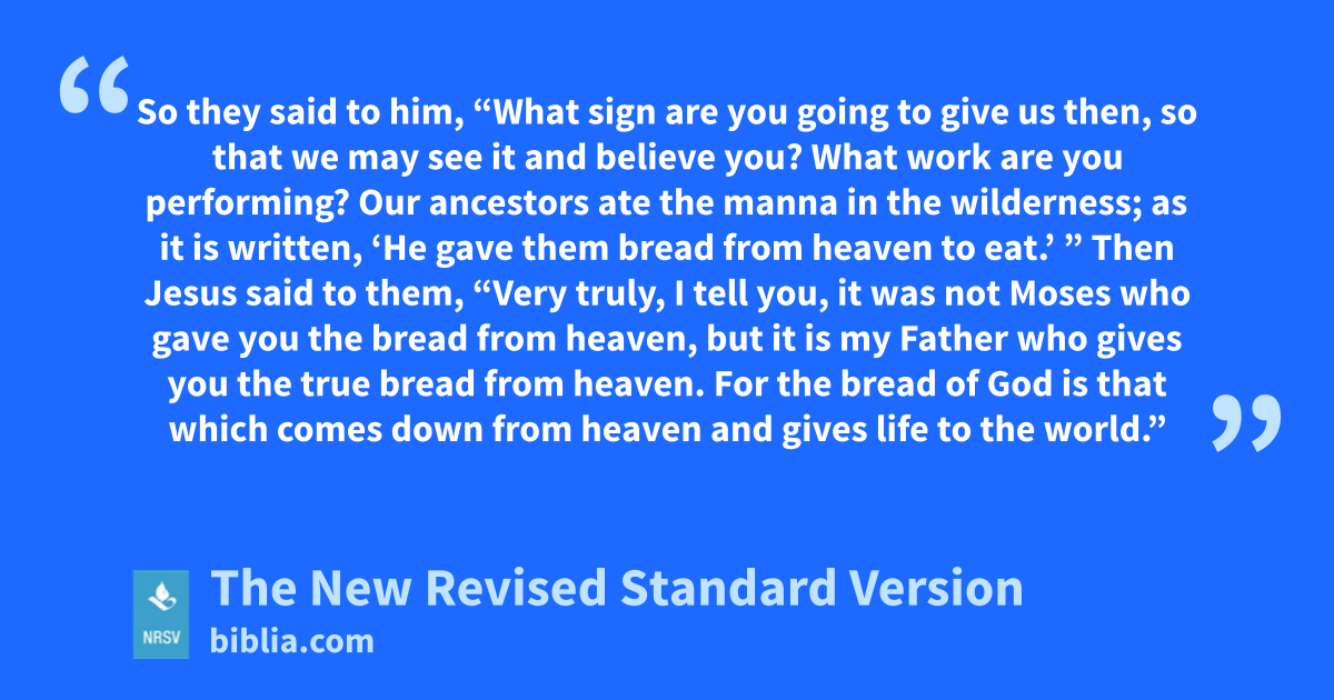 So they said to him, “What sign are you going to give us then, so that we may see it and believe you? What work are you performing? Our ancestors ate the manna in the wilderness; as it is written, ‘He gave them bread from heaven to eat.’ ” Then Jesus said to them, “Very truly, I tell you, it was not Moses who gave you the bread from heaven, but it is my Father who gives you the true bread from heaven. For the bread of God is that which comes down from heaven and gives life to the world.”