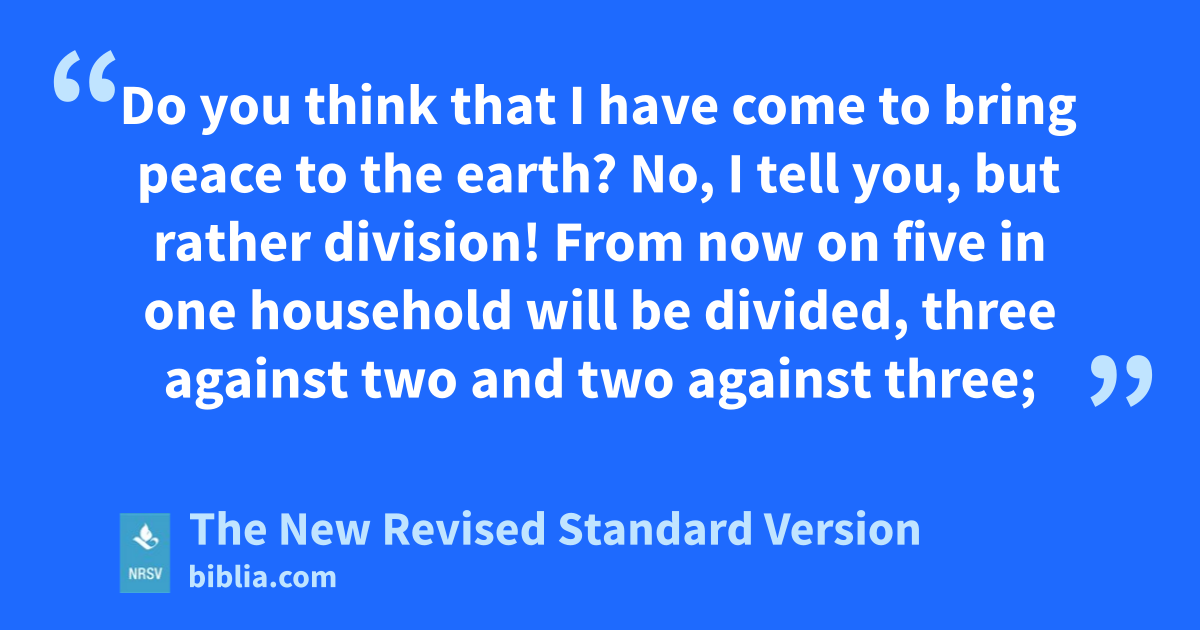 Do you think that I have come to bring peace to the earth? No, I tell you, but rather division! From now on five in one household will be divided, three against two and two against three;