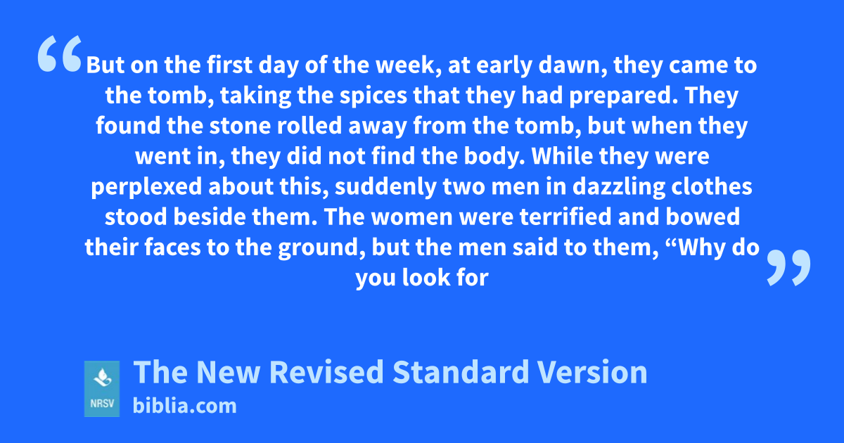 But on the first day of the week, at early dawn, they came to the tomb, taking the spices that they had prepared. They found the stone rolled away from the tomb, but when they went in, they did not find the body. While they were perplexed about this, suddenly two men in dazzling clothes stood beside them. The women were terrified and bowed their faces to the ground, but the men said to them, “Why do you look for