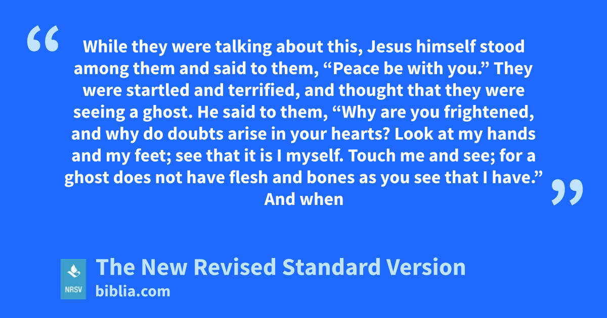 While they were talking about this, Jesus himself stood among them and said to them, “Peace be with you.” They were startled and terrified, and thought that they were seeing a ghost. He said to them, “Why are you frightened, and why do doubts arise in your hearts? Look at my hands and my feet; see that it is I myself. Touch me and see; for a ghost does not have flesh and bones as you see that I have.” And when