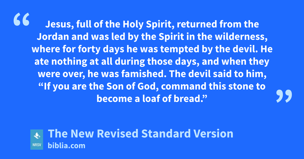 Jesus, full of the Holy Spirit, returned from the Jordan and was led by the Spirit in the wilderness, where for forty days he was tempted by the devil. He ate nothing at all during those days, and when they were over, he was famished. The devil said to him, “If you are the Son of God, command this stone to become a loaf of bread.”