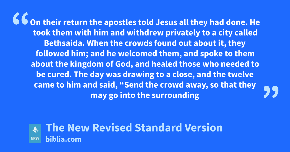 On their return the apostles told Jesus all they had done. He took them with him and withdrew privately to a city called Bethsaida. When the crowds found out about it, they followed him; and he welcomed them, and spoke to them about the kingdom of God, and healed those who needed to be cured. The day was drawing to a close, and the twelve came to him and said, “Send the crowd away, so that they may go into the surrounding