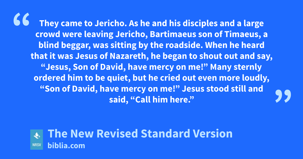 They came to Jericho. As he and his disciples and a large crowd were leaving Jericho, Bartimaeus son of Timaeus, a blind beggar, was sitting by the roadside. When he heard that it was Jesus of Nazareth, he began to shout out and say, “Jesus, Son of David, have mercy on me!” Many sternly ordered him to be quiet, but he cried out even more loudly, “Son of David, have mercy on me!” Jesus stood still and said, “Call him here.”