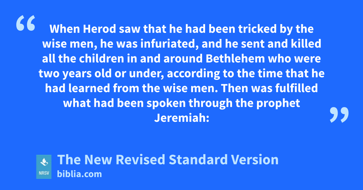 When Herod saw that he had been tricked by the wise men, he was infuriated, and he sent and killed all the children in and around Bethlehem who were two years old or under, according to the time that he had learned from the wise men. Then was fulfilled what had been spoken through the prophet Jeremiah: