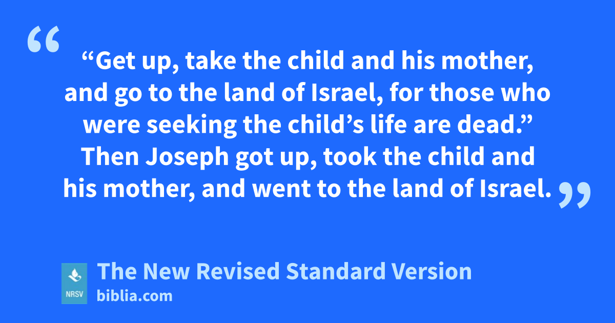 “Get up, take the child and his mother, and go to the land of Israel, for those who were seeking the child’s life are dead.” Then Joseph got up, took the child and his mother, and went to the land of Israel.