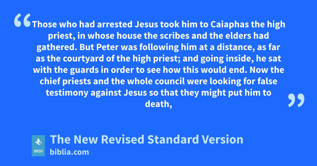 Those who had arrested Jesus took him to Caiaphas the high priest, in whose house the scribes and the elders had gathered. But Peter was following him at a distance, as far as the courtyard of the high priest; and going inside, he sat with the guards in order to see how this would end. Now the chief priests and the whole council were looking for false testimony against Jesus so that they might put him to death,