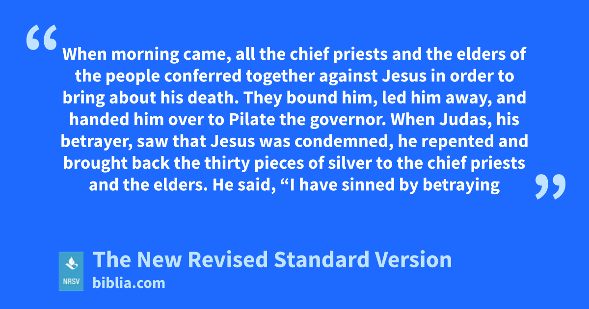 When morning came, all the chief priests and the elders of the people conferred together against Jesus in order to bring about his death. They bound him, led him away, and handed him over to Pilate the governor. When Judas, his betrayer, saw that Jesus was condemned, he repented and brought back the thirty pieces of silver to the chief priests and the elders. He said, “I have sinned by betraying