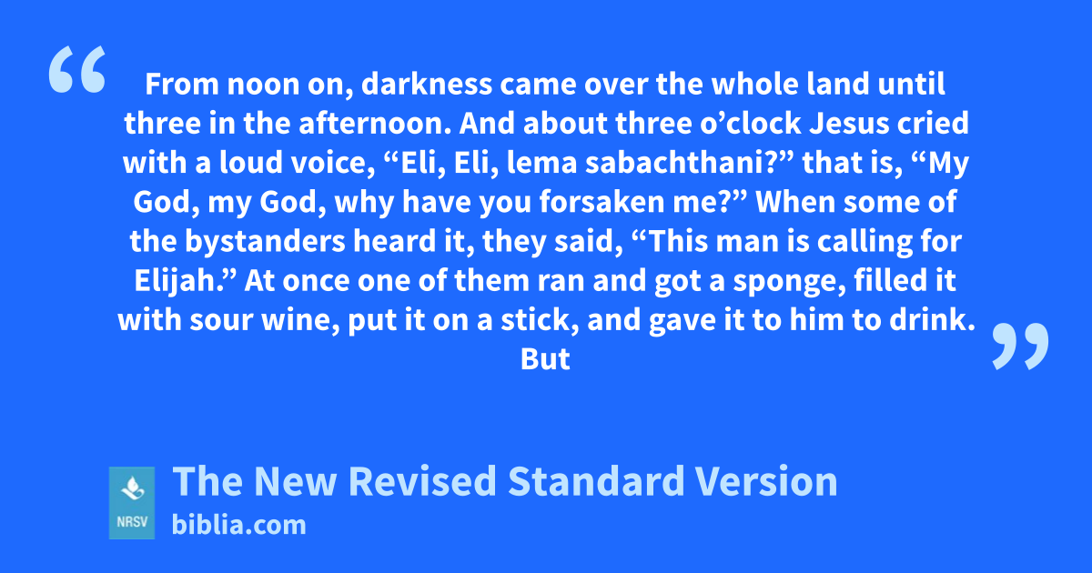 From noon on, darkness came over the whole land until three in the afternoon. And about three o’clock Jesus cried with a loud voice, “Eli, Eli, lema sabachthani?” that is, “My God, my God, why have you forsaken me?” When some of the bystanders heard it, they said, “This man is calling for Elijah.” At once one of them ran and got a sponge, filled it with sour wine, put it on a stick, and gave it to him to drink. But