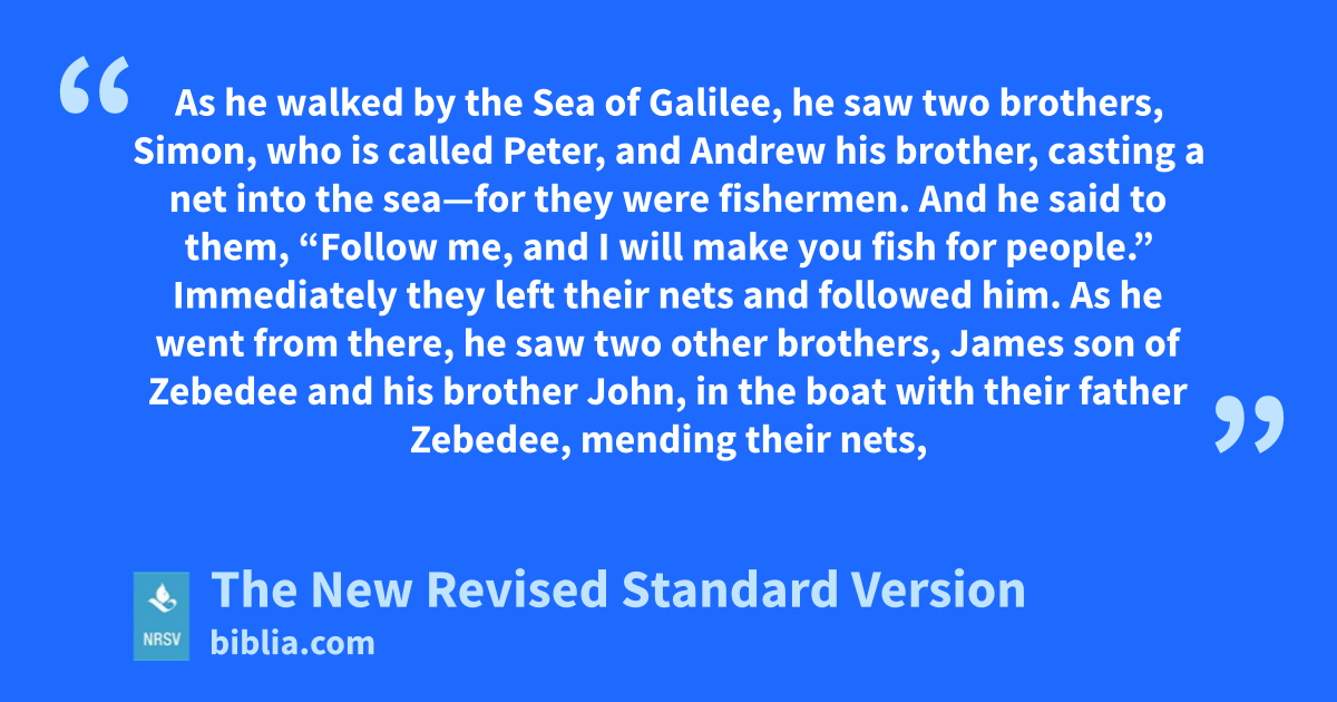 As he walked by the Sea of Galilee, he saw two brothers, Simon, who is called Peter, and Andrew his brother, casting a net into the sea—for they were fishermen. And he said to them, “Follow me, and I will make you fish for people.” Immediately they left their nets and followed him. As he went from there, he saw two other brothers, James son of Zebedee and his brother John, in the boat with their father Zebedee, mending their nets,