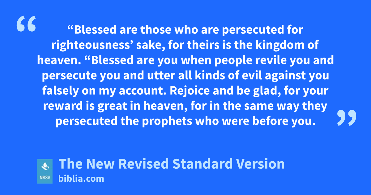 “Blessed are those who are persecuted for righteousness’ sake, for theirs is the kingdom of heaven. “Blessed are you when people revile you and persecute you and utter all kinds of evil against you falsely on my account. Rejoice and be glad, for your reward is great in heaven, for in the same way they persecuted the prophets who were before you.