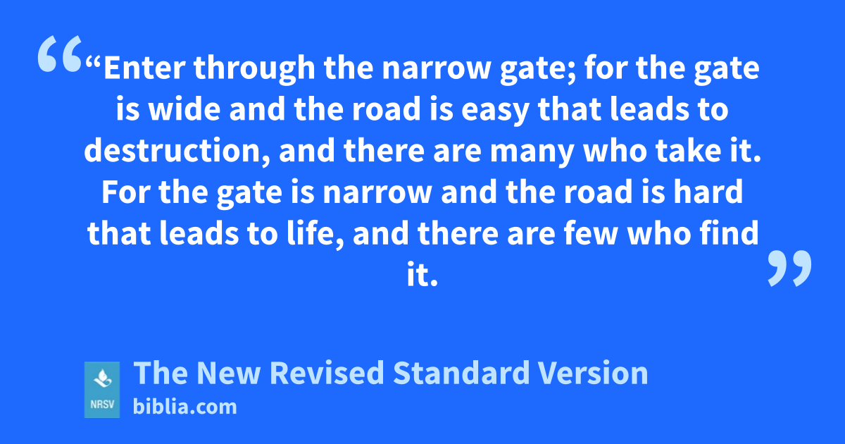 “Enter through the narrow gate; for the gate is wide and the road is easy that leads to destruction, and there are many who take it. For the gate is narrow and the road is hard that leads to life, and there are few who find it.