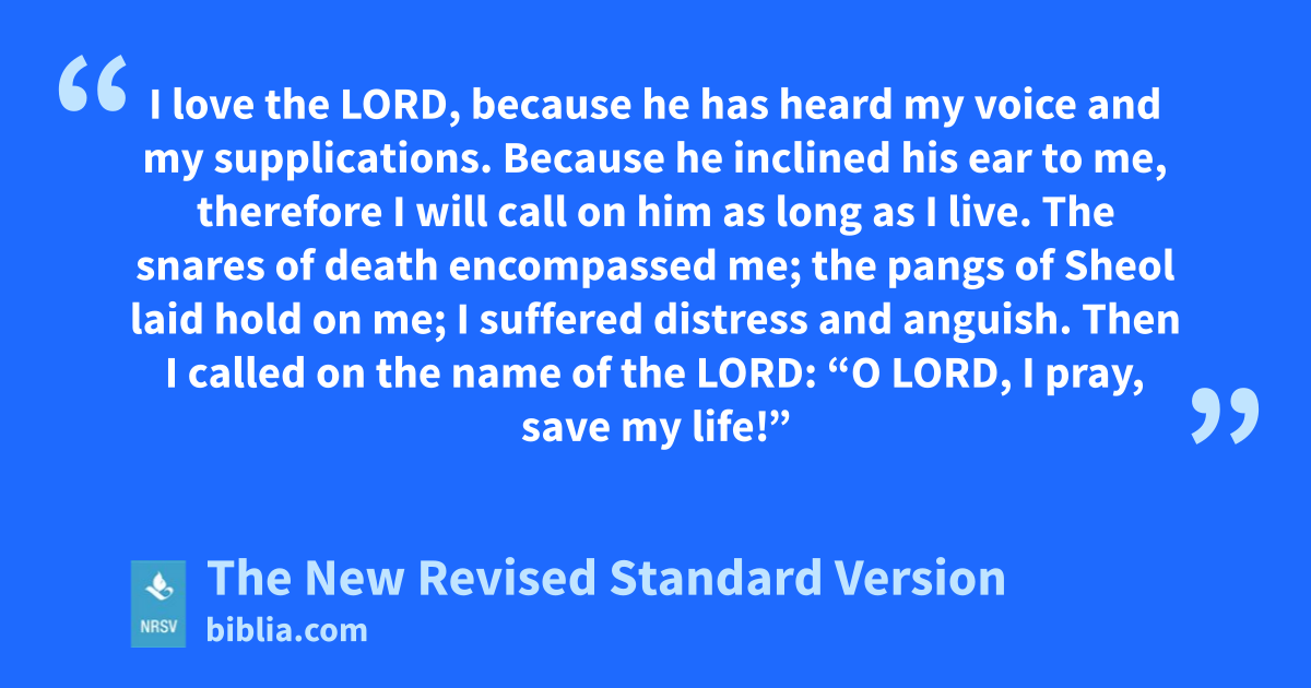 I love the LORD, because he has heard my voice and my supplications. Because he inclined his ear to me, therefore I will call on him as long as I live. The snares of death encompassed me; the pangs of Sheol laid hold on me; I suffered distress and anguish. Then I called on the name of the LORD: “O LORD, I pray, save my life!”
