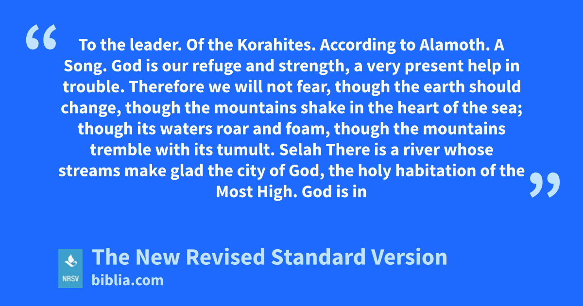 To the leader. Of the Korahites. According to Alamoth. A Song. God is our refuge and strength, a very present help in trouble. Therefore we will not fear, though the earth should change, though the mountains shake in the heart of the sea; though its waters roar and foam, though the mountains tremble with its tumult. Selah There is a river whose streams make glad the city of God, the holy habitation of the Most High. God is in