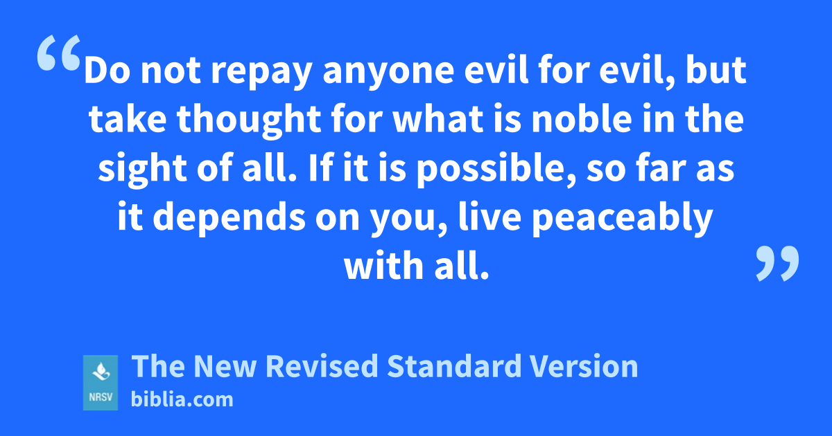 Do not repay anyone evil for evil, but take thought for what is noble in the sight of all. If it is possible, so far as it depends on you, live peaceably with all.