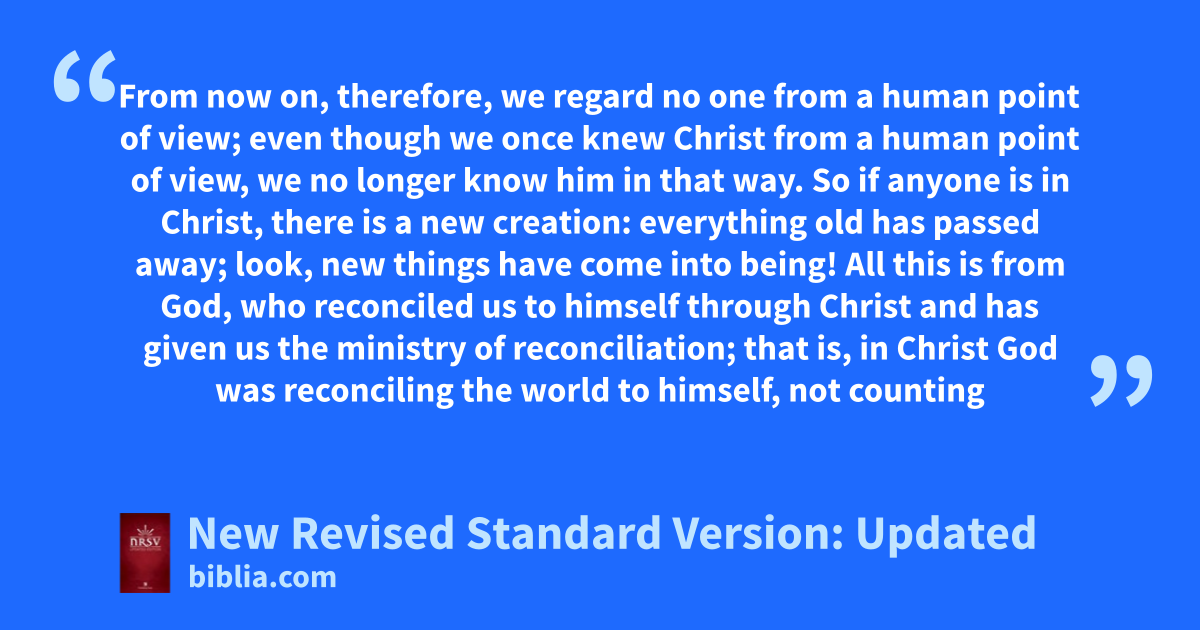 16 From now on, therefore, we regard no one from a human point of view;t even though we once knew Christ from a human point of view,u we no longer know him in that way.* 17 So if anyone is in Christ, therev is a new creation: everything old has passed away; look, new things have come into being!w,* 18 All this is from God, who reconciled us to himself through Christ and has given us the ministry of reconciliation;* 19 that is, in Christ God was reconciling the world to himself,x not counting their trespasses against them, and entrusting the message of reconciliation to us.* 20 So we are ambassadors for Christ, since God is making his appeal through us; we entreat you on behalf of Christ: be reconciled to God.* 21 For our sake God made the one who knew no sin to be sin, so that in him we might become the righteousness of God.*